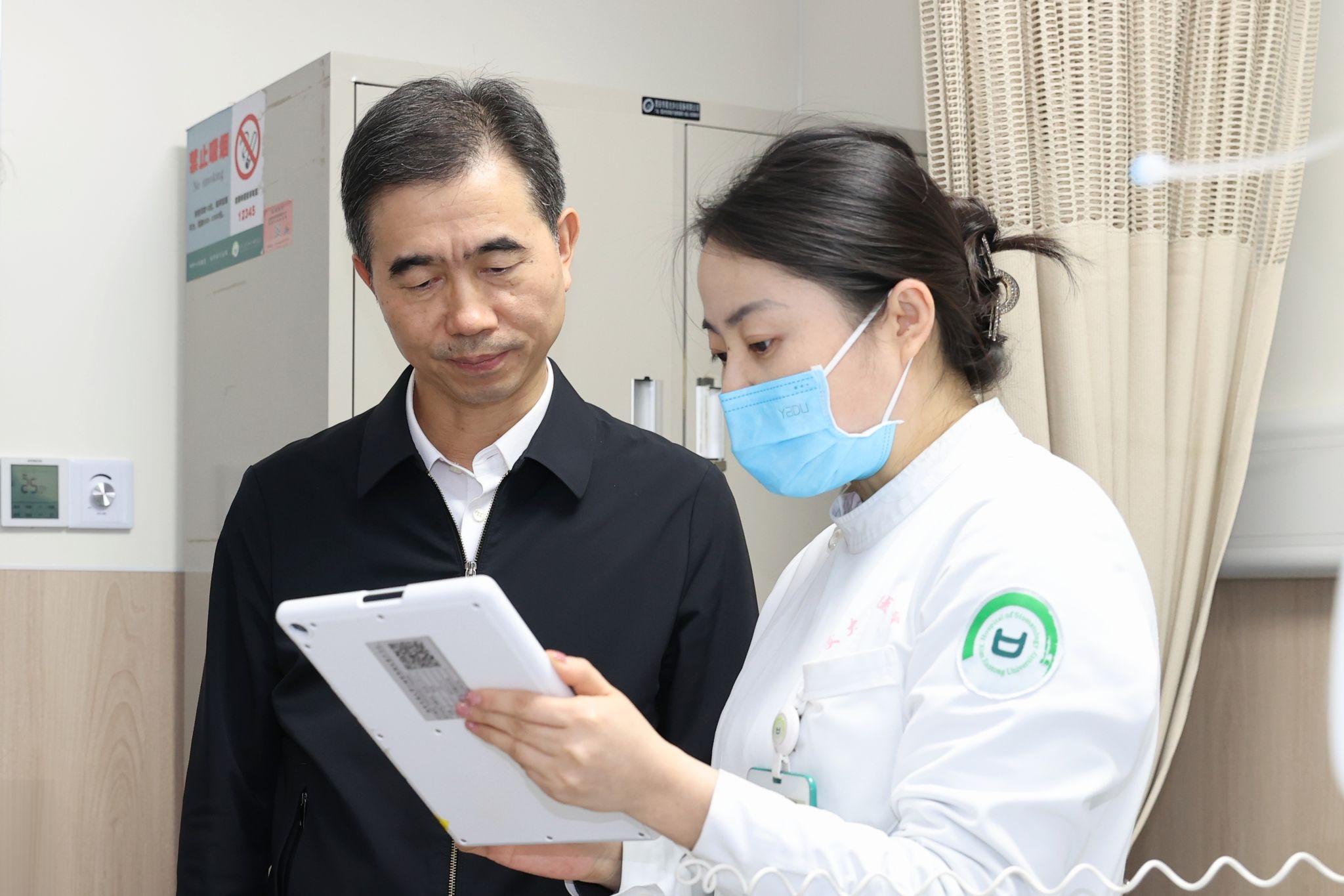 张军林一行先后到医院消毒供应中心、无陪护病房、智慧医院建设部、智慧安防中心、口腔健康科普基地、培训中心等区域,详细了解医院诊疗服务流程、智慧化建设进展、口腔健康科普等工作情况,与一线医务人员深入交流。