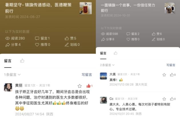 科室的李征阳医生也屡获好评,曾有家长深情留言:“孩子矫正牙齿好几年了,治疗时遇到的医生大多数都很好,其中李征阳医生尤其好!终身难忘的好。”而在全麻治疗领域,张媛媛医生也以精湛技术和细致关怀,赢得了“给张医生点赞”的真挚认可。这些来自陕西乃至海外的感谢,不仅是对医生个人的肯定,更是对整个科室的信任与鼓励。