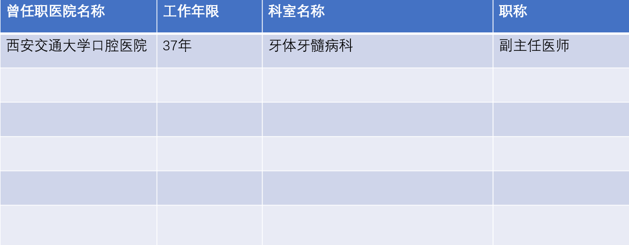 简介:毕业于西安交通大学口腔医学专业(原西安医科大学口腔系),副主任医师,曾任西安交通大学口腔医院牙体牙髓病科主任;中华口腔医学会口腔药学专委会常委;中华口腔医学会老年口腔专委会委员;陕西口腔医学会牙体牙髓病专委会常委。在牙体牙髓病及口腔预防保健方面有很深的研究和丰富的临床经验。擅长牙体美容修复及无痛根管治疗技术。