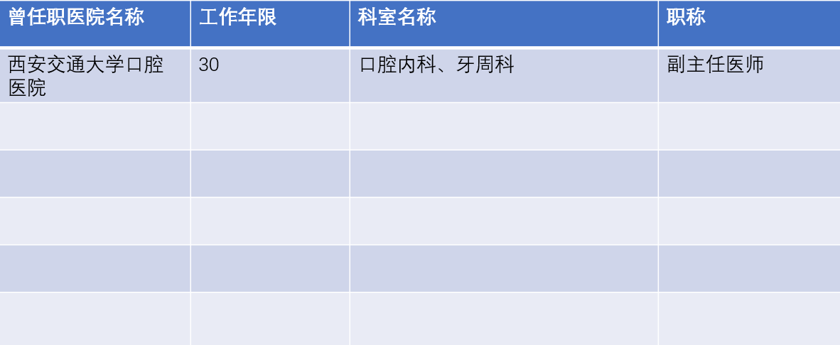 简介:副主任医师,硕士研究生。中华口腔医学会会员,陕西省口腔医学会牙周病学专委会委员,陕西省老年保健医学会理事会理事。原西安医科大学口腔系毕业留校,长期从事口腔内科临床教学工作。在牙周病的预防、诊治方面有丰富的临床经验。